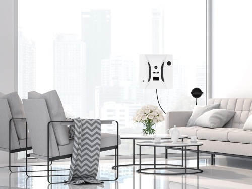 Robotický čistič je připojen k elektrické zásuvce pomocí napájecího kabelu. V případě výpadku napájení se aktivuje vestavěná záložní baterie. Další ochranou je odolné bezpečnostní lanko s karabinou, kterou můžete připevnit s pomocí přiložené přísavky k oknu nebo na jiné vhodné místo.