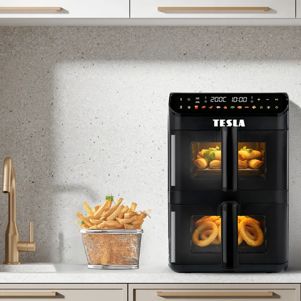 V každém balení horkovzdušné fritézy TESLA naleznete kuchařku plnou inspirativních receptů. Připravte si dokonale například smažený sýr, kuřecí křídla, pečeného lososa nebo sladké plněné taštičky. Každý recept je přehledně zpracován krok za krokem a obsahuje doporučené nastavení teploty i času pečení, aby byl výsledek vždy perfektní.