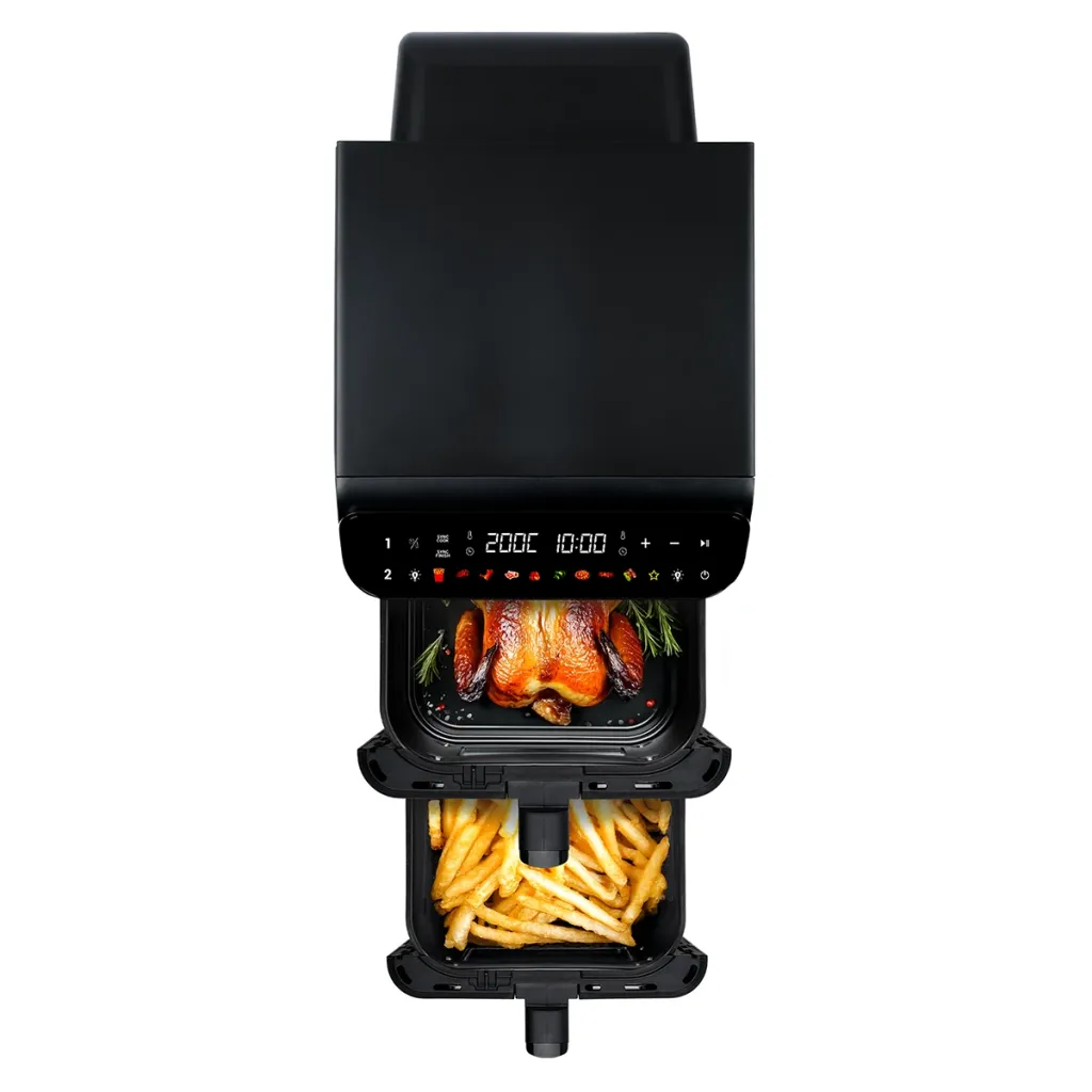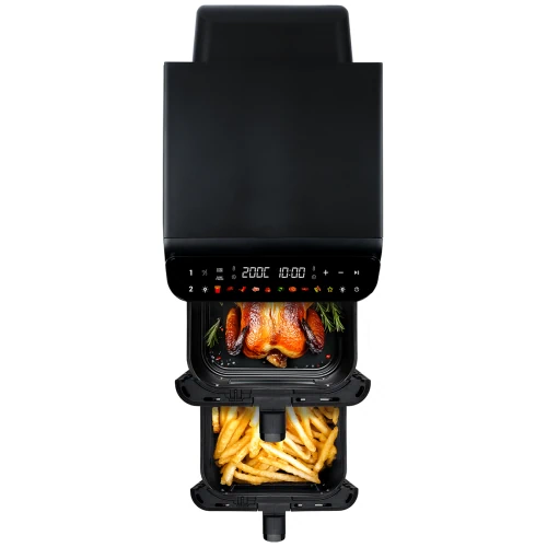 Multifunkční fritéza s vertikálním uspořádáním šetří místo na kuchyňské lince a umožňuje efektivnější organizaci prostoru. Dva koše o objemu 5,5 litru jsou umístěny nad sebou, přesto celková šířka zařízení nepřesahuje 26,5 cm. Kompaktní konstrukce neomezuje kapacitu a zároveň se snadno vejde pod běžnou kuchyňskou skříňku. Každý koš je vybaven průzorovým okénkem s osvětlením, které usnadňuje kontrolu průběhu vaření bez nutnosti otevírání.
