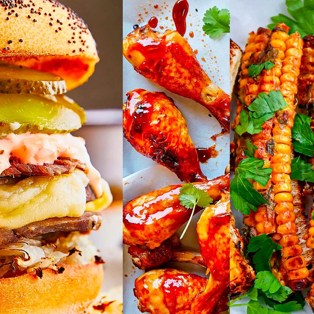Koláž různých jídel připravených v multifunkční horkovzdušné fritéze TESLA AirCook Q60 XXL Pro, včetně burgerů, grilovaných kuřecích paliček a kukuřice. Široké možnosti vaření s fritézou TESLA.