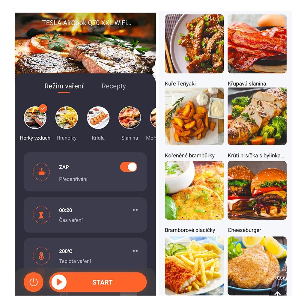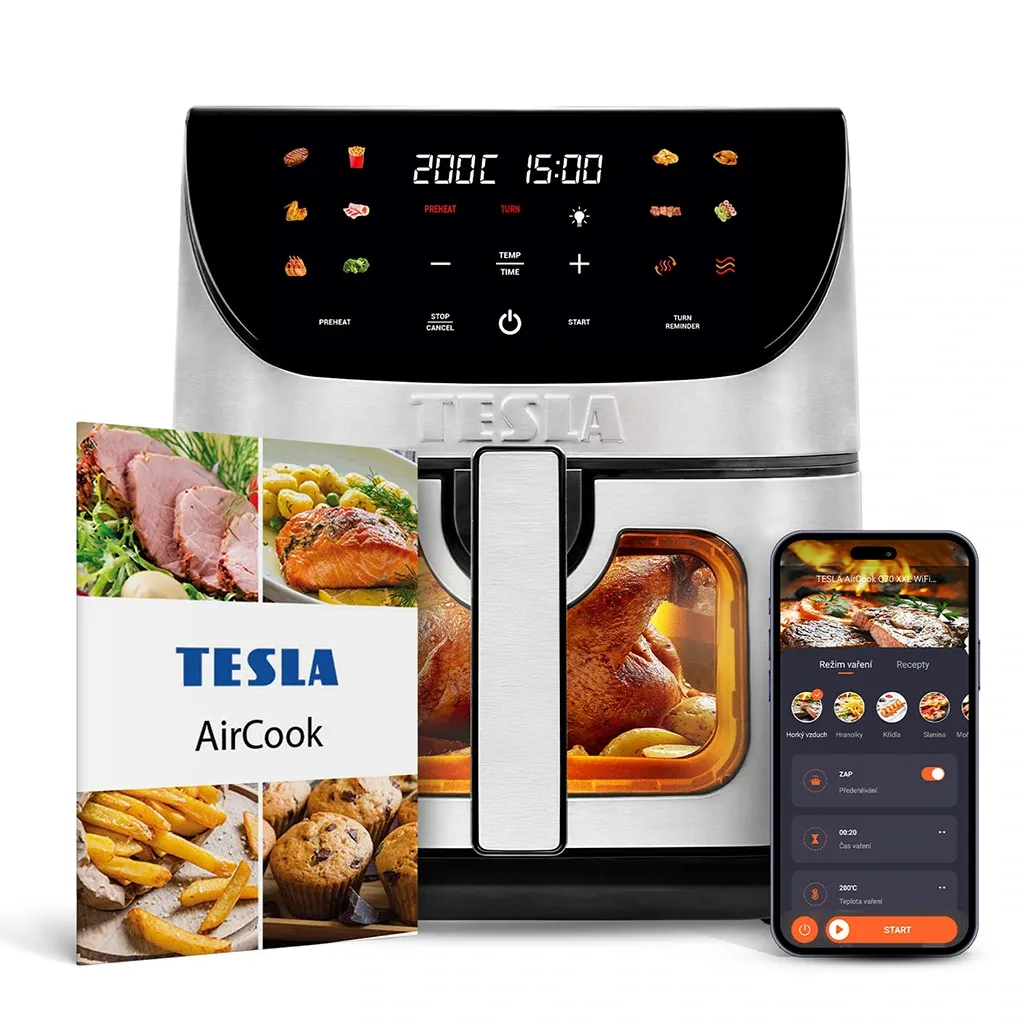 Multifunkční horkovzdušnou fritézu TESLA AirCook Q70 XXL WiFi Pro je možné ovládat s pomocí aplikace v češtině ve vašem telefonu. Pohodlně tak nastavíte teplotu a délku vaření, vyberete některý z přednastavených programů nebo se můžete inspirovat našimi recepty k vaření.