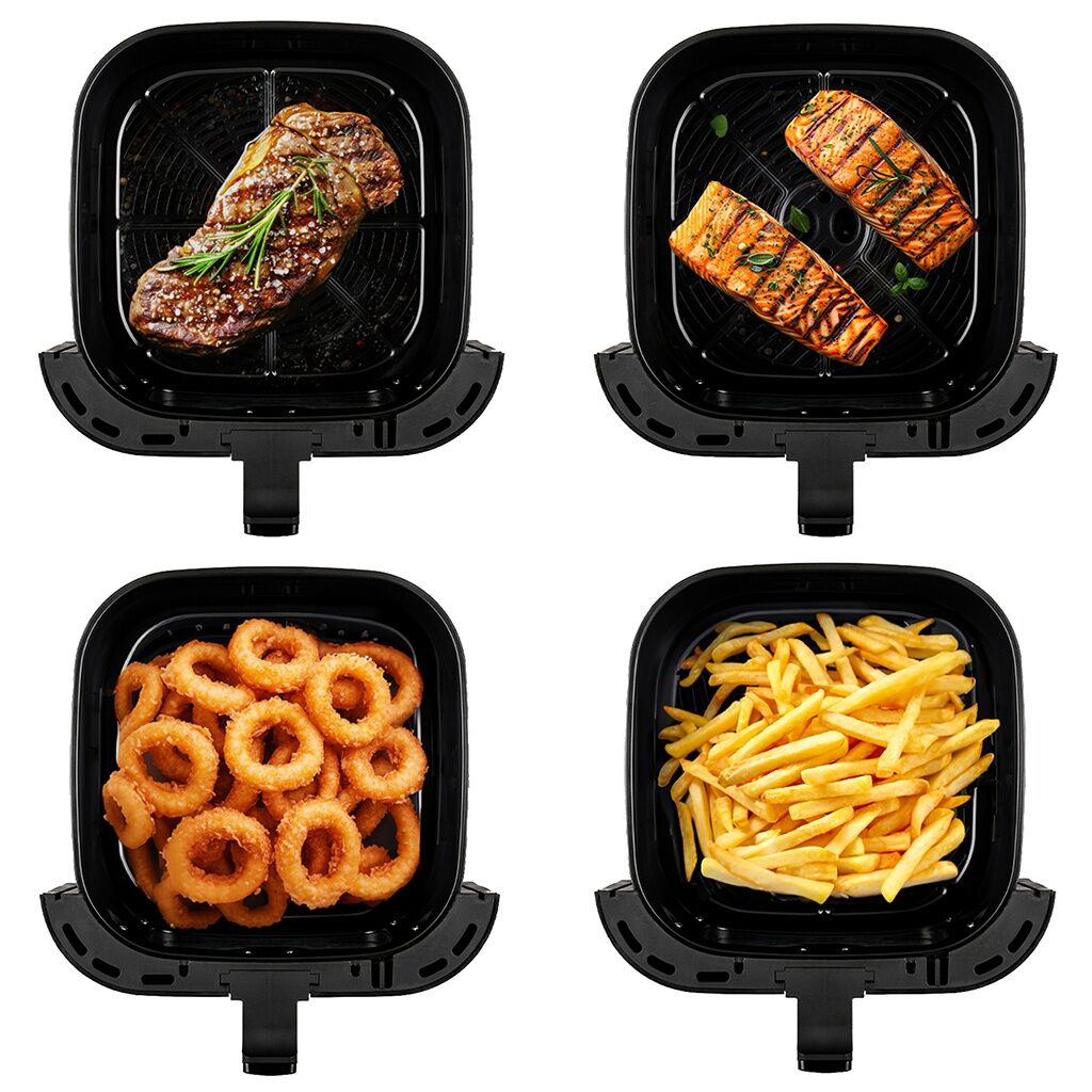 Na digitálním displeji, který je ergonomicky natočen směrem k vám pro snadnější čtení, si můžete ručně nastavit požadovaný čas a teplotu vaření nebo si vybrat z přednastavených programů jako jsou steak, hranolky, zelenina nebo kuře.