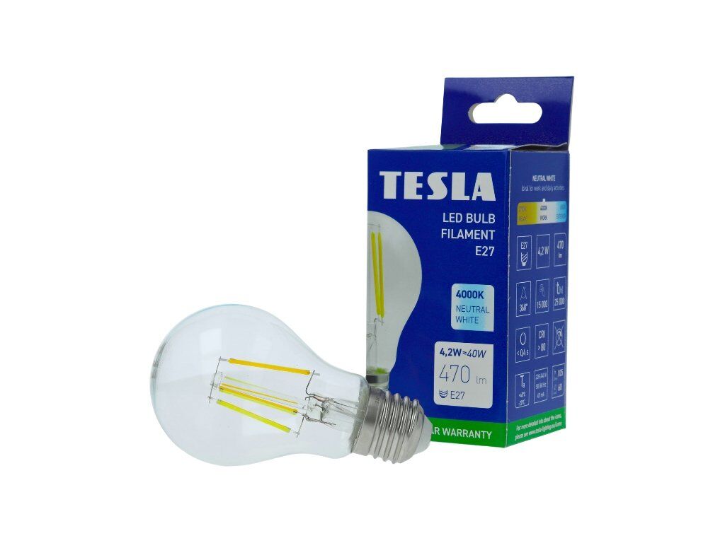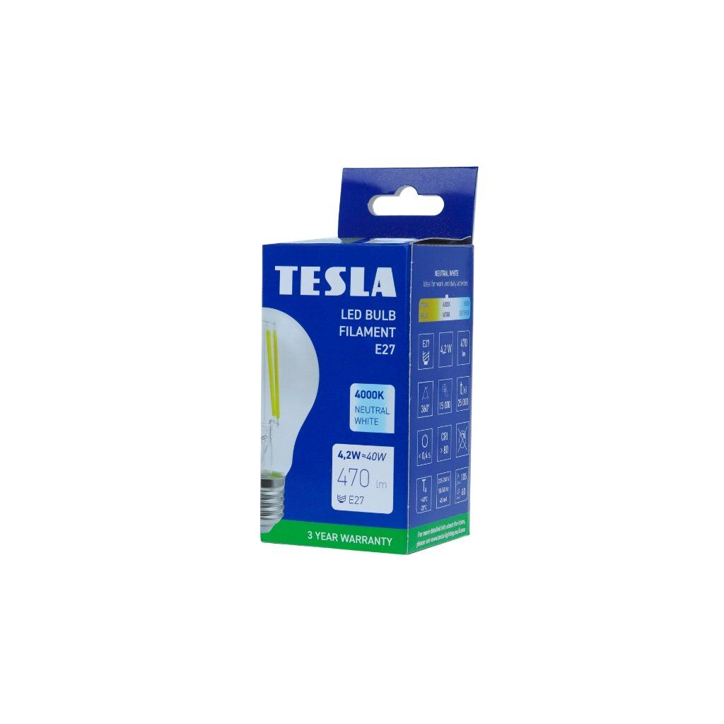 LED žárovka TESLA BL270440-1 mistrně kombinuje moderní LED technologii s retro šarmem klasických žárovek. Díky patici E27 a výkonu 4,2W je ideální, energeticky úspornou náhradou za tradiční 40W žárovky, a to s označením energetické třídy E (dříve A+).