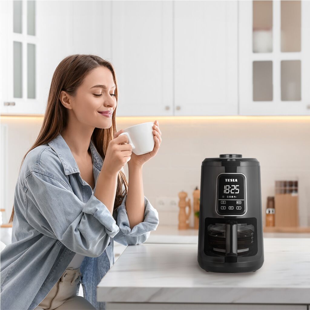 Kávovar s integrovaným mlýnkem TESLA CoffeeStar ES400 v kuchyni ušetří mnoho místa. Skleněná konvice o objemu 600 ml je vhodná pro přibližně čtyři šálky kávy, což je ideální velikost pro rodinu nebo jednotlivce.