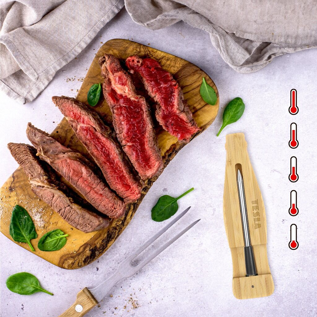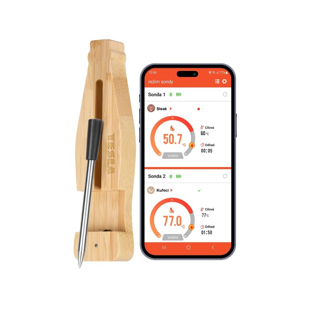 Získejte dokonalou kontrolu nad přípravou pokrmů s bezdrátovou teplotní sondou TESLA Cook BBQ200, která se snadno připojí k vašemu mobilnímu telefonu přes Bluetooth, což vám umožní přesně sledovat teplotu uvnitř masa. Díky tomu připravíte každý pokrm přesně podle svých preferencí, jako profesionální šéfkuchaři.