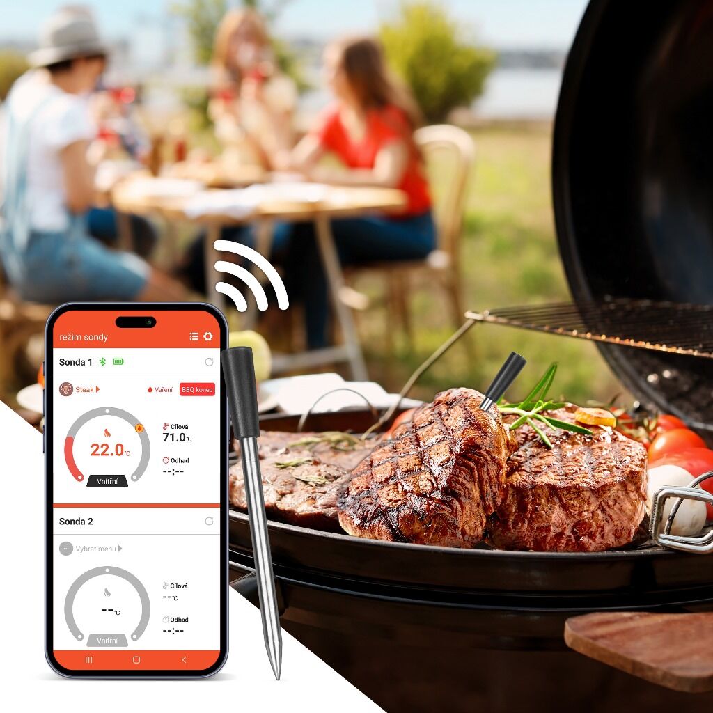 Díky připojení přes Bluetooth 5.2 je zajištěna stabilní a rychlá komunikace mezi vaším telefonem a teplotní sondou. Mobilní aplikace, dostupná pro systémy Android a iOS, vám umožňuje maximální kontrolu nad vařením. Aplikace je dostupná v češtině, slovenštině, polštině i angličtině a umožňuje připojení až 6 sond najednou, což je ideální pro komplexní vaření a grilování.