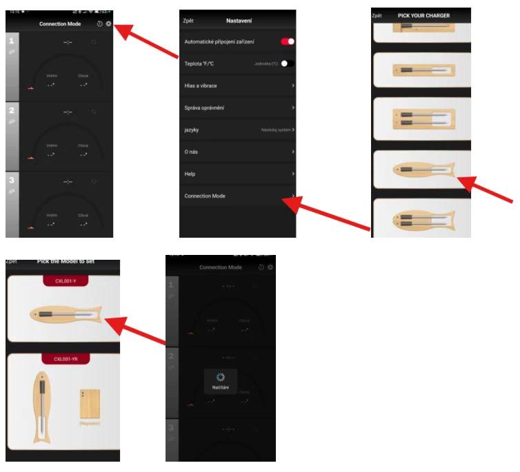 Jakmile je sonda plně nabita, odpojte ji pro spárování od nabíjecího adaptéru a vyjměte z nabíjecího „pouzdra“. V aplikaci vyberte model sondy dle obrázků níže.