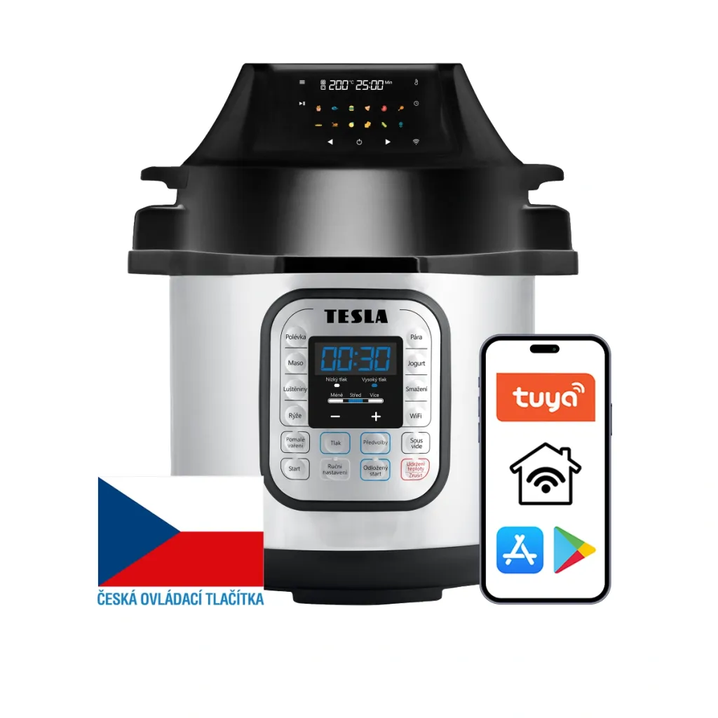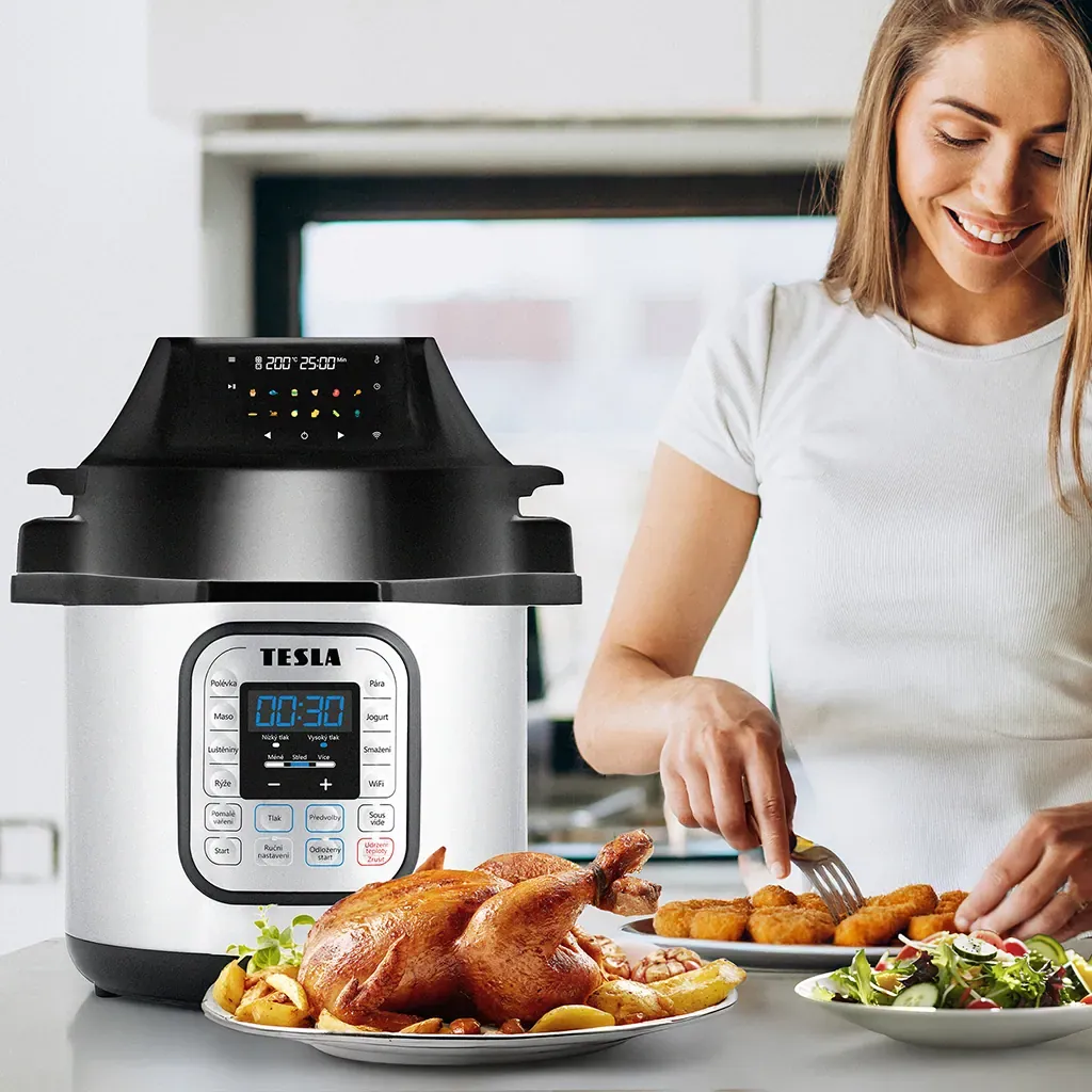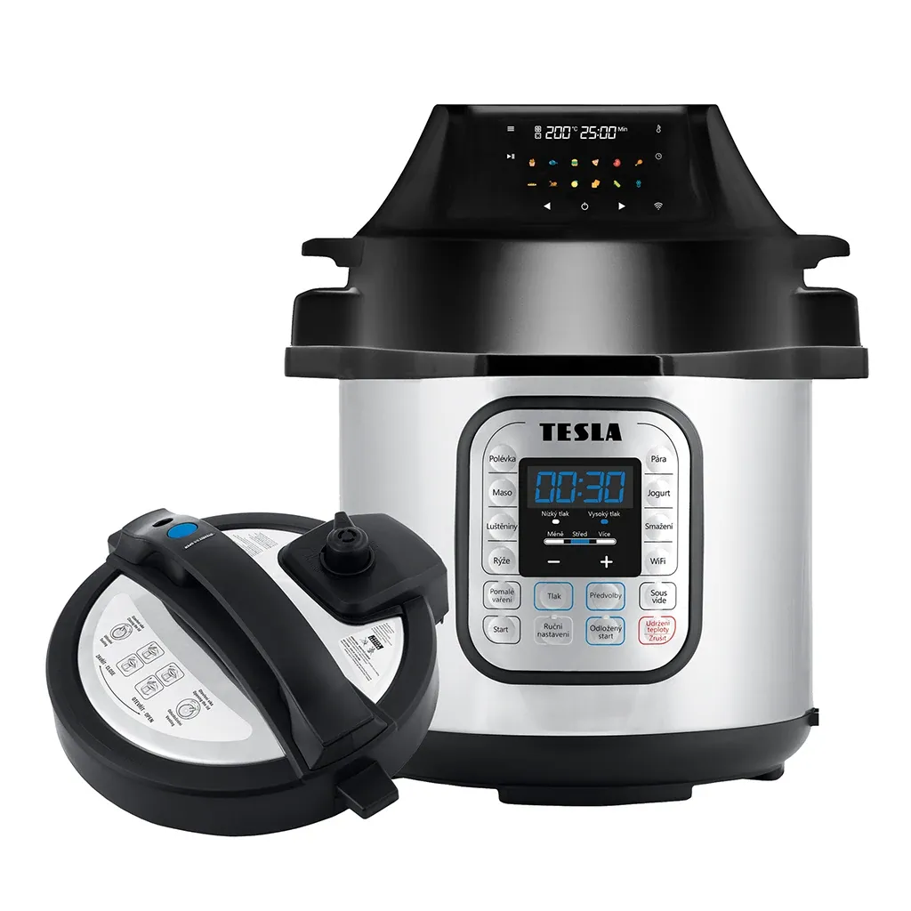 Multifunkční elektrický tlakový hrnec TESLA EliteCook K70 WiFi Duo je tlakový hrnec, horkovzdušná fritéza, Sous vide (program s teplotním rozsahem 50-58 °C), pomalý hrnec, rýžovar, jogurtovač, vařič vajíček, ohřívač jídla, sušička jídla, sterilizátor, napařovací hrnec, pánev na smažení nebo restování. Můžete vařit pod tlakem, využít pomalé vaření, vařit metodou Sous vide, vyrobit si vlastní jogurt, využít vaření na páře a odložený start nebo si pochutnat například na klasickém vývaru, guláši, hovězí/vepřové pečeni, kuřeti, chilli, těstovinách, masových kuličkách, zelí, perkeltu, bramborách, rýži, luštěninách a dalších podobně jako v klasickém tlakovém hrnci. Navíc také získáte možnost upéct si křupavé kuře, hranolky, steak, rybu nebo zapéct jídlo horkým vzduchem.