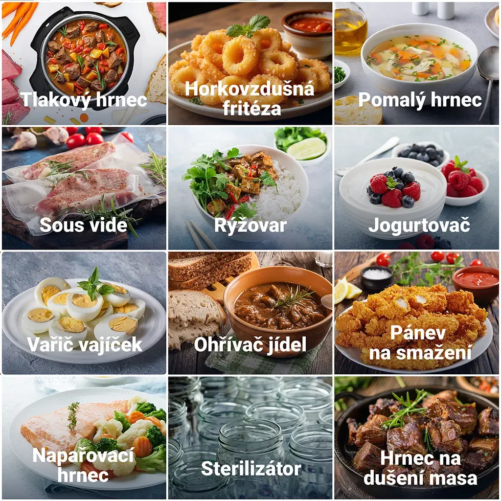 • 12v1: tlakový hrnec, horkovzdušná fritéza, Sous vide, pomalý hrnec, rýžovar, jogurtovač, vařič vajíček, ohřívač jídla, sušička jídla, sterilizátor, napařovací hrnec, pánev na smažení nebo restování