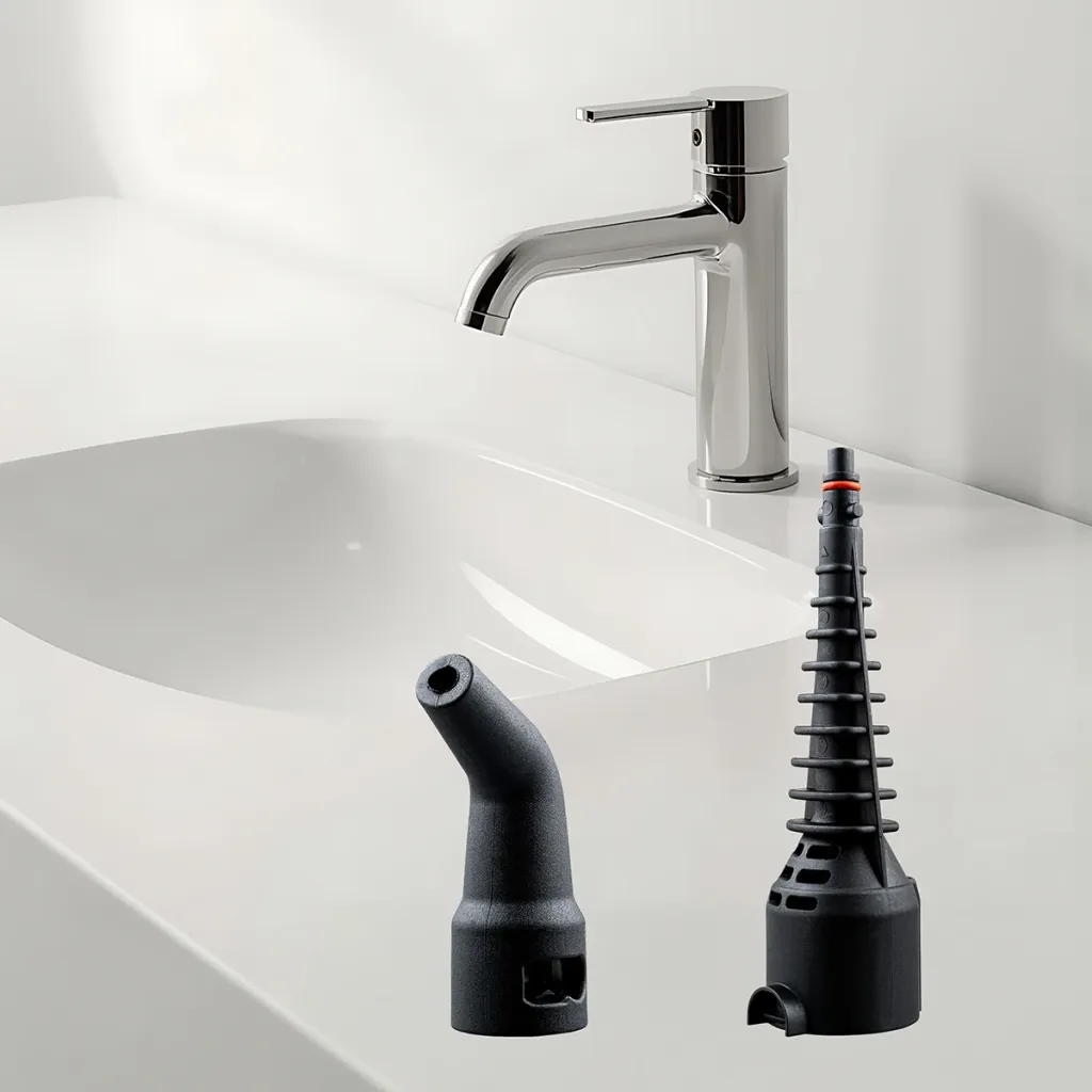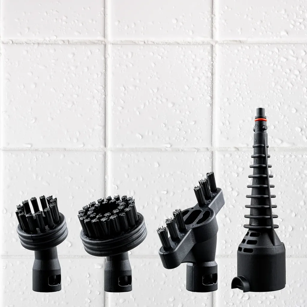 Parní trysky (standardní + úhlová) – parní čištění různých povrchů včetně hůře dostupných míst (např. baterie, umyvadla).