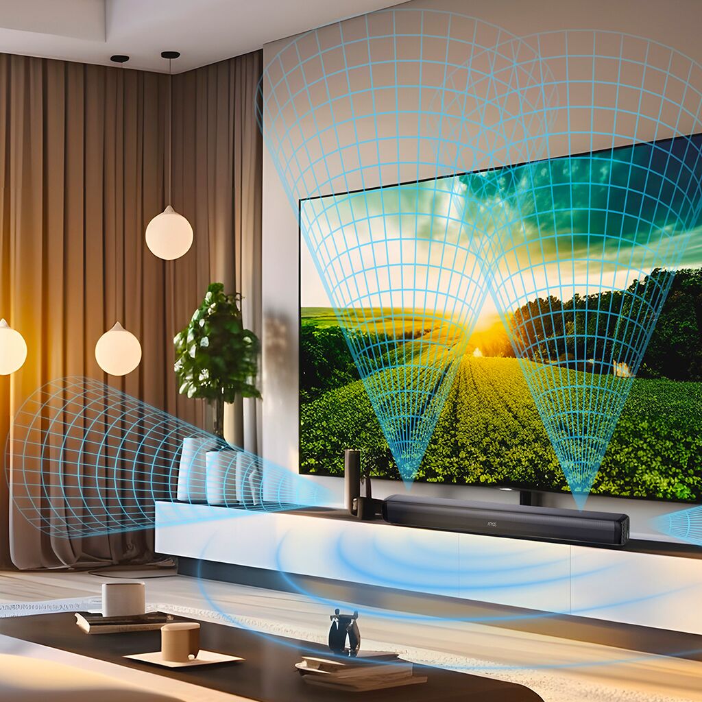 Soundbar poskytuje hluboké basy, které vám umožní cítit každý tón ve vaší oblíbené hudbě nebo filmu. Nejenže basy jsou bohatší a plnější, ale také výšky jsou křišťálově čisté a přesné, což zajišťuje ostrý a detailní zvukový zážitek. Tato kombinace výjimečných basů a ostrých výšek znamená, že vše od nejjemnějších tónů po nejsilnější beaty je reprodukováno s maximální čistotou a rozlišením.