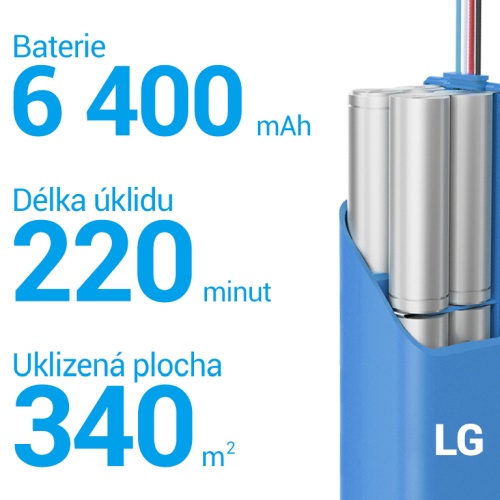Základem každého elektronického produktu je vždy baterie. Bateriové články značky LG vás ohromí svou celkovou kapacitou 6 400 mAh. Zajistí dostatek energie pro 220 minut úklidu na ploše až 340 m².