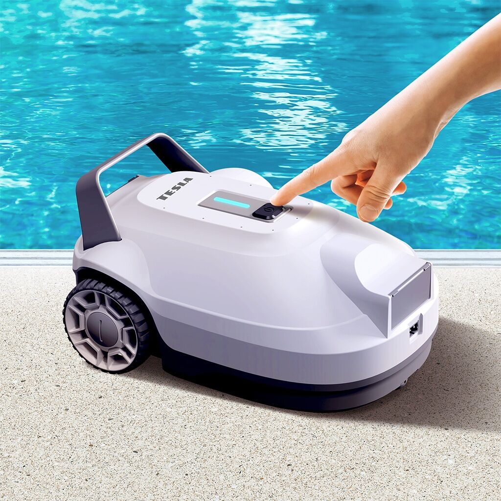 Prst tlačící na tlačítko na bílém robotickém bazénovém vysavači TESLA RoboStar SP300, který stojí u modrého bazénu.