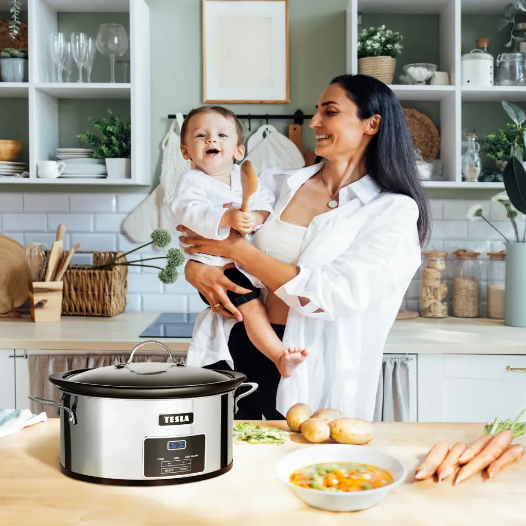 Pomalý hrnec TESLA je výborný pomocník pro všechny, kteří si chtějí připravit plnohodnotné a chutné jídlo, aniž by u vaření trávili dlouhé hodiny. Stačí do něj vložit všechny ingredience, nastavit teplotu s délkou vaření a to je vše. Pomalý hrnec vám svým úsporným vařením připraví jídlo hotové přímo k servírování. Využijete jej pro každodenní vaření i pro speciální akce či narozeninové oslavy. Plánujete během své párty podávat třeba guláš? Náš pomalý hrnec ho za vás nejen uvaří, ale díky své funkci „Udržování teploty“ ho zachová teplý po celou dobu vaší oslavy. Jeho moderní design navíc ozdobí jakoukoliv kuchyň či servírovací pult.