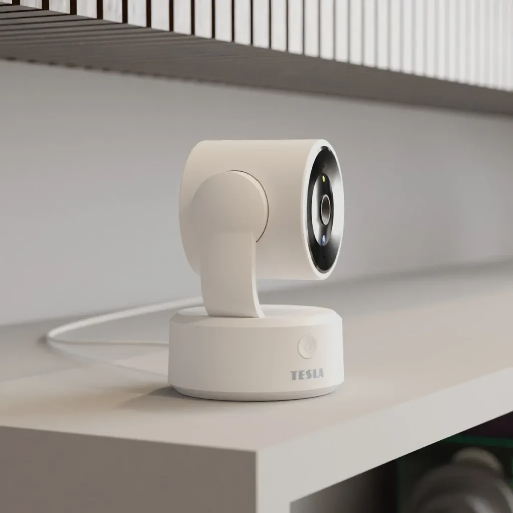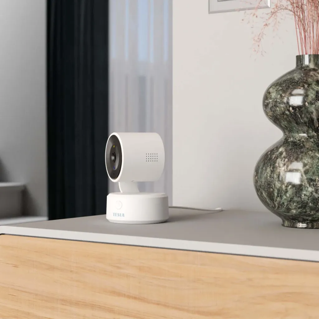 Kameru lze umístit kamkoli na rovnou plochu – postavte ji třeba na stůl nebo namontujte na strop. Díky zornému úhlu 115 stupňů s rozsahem otočení 360 stupňů horizontálně a 180 stupňů vertikálně budete mít pod kontrolou celou místnost. Ovládání Pan and Tilt umožňuje pohyb po obou osách, snadno ji tedy nastavíte tak, aby snímala všechny strategické body. Tyto body si můžete navíc uložit v aplikaci TESLA Smart a využít je v chytrých scénách. Například nastavit, že se při odchodu z domova kamera automaticky otočí na vchodové dveře.