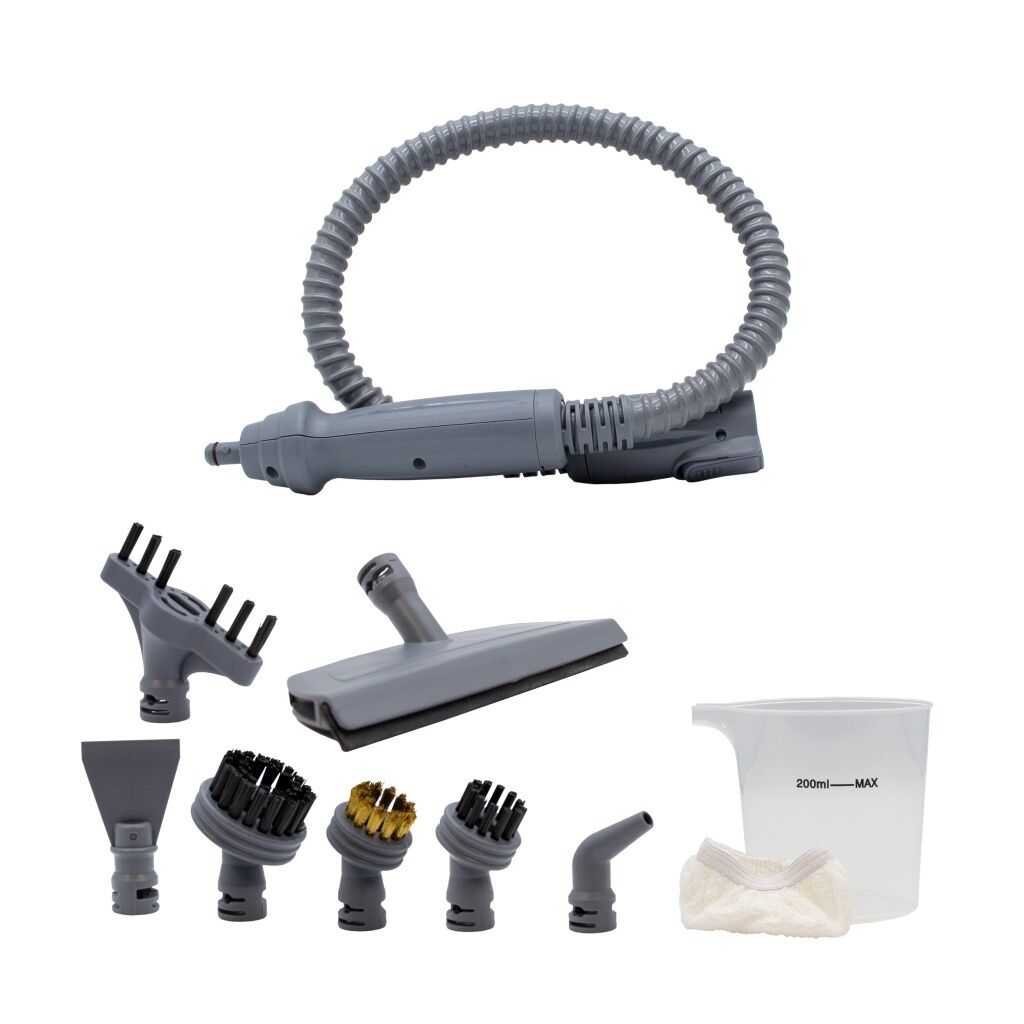 Kompletní příslušenství pro parní mop se zásobníkem na čistící prostředek TESLA SteamPower FX50. Úklid domácnosti může pokračovat.