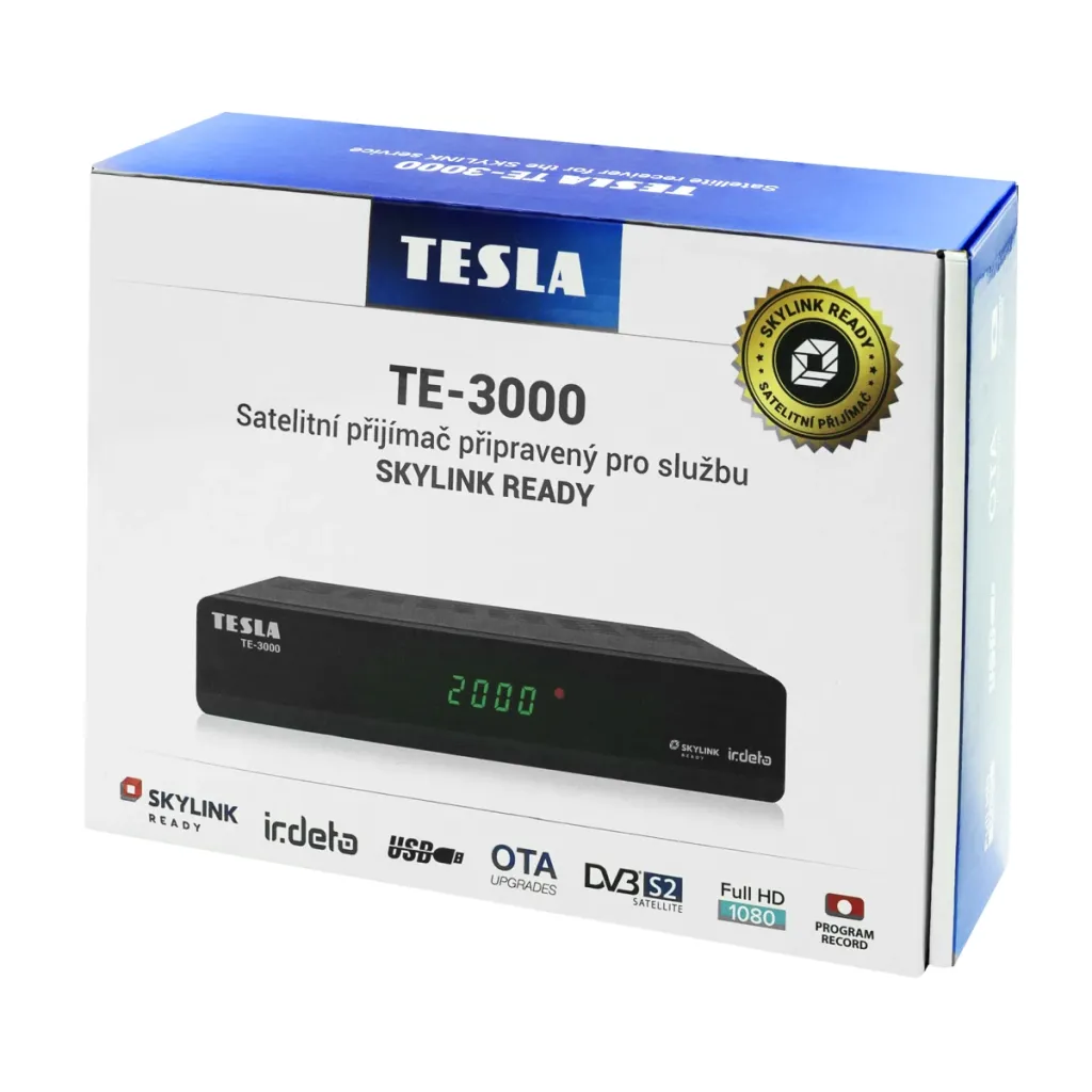TESLA TE-3000 je moderní satelitní DVB-S2 přijímač s vestavěným dekodérem Irdeto a certifikací Skylink Ready v1.5. Nabízí Full HD obraz, nahrávání na USB, TimeShift a snadné ladění díky FastScan.